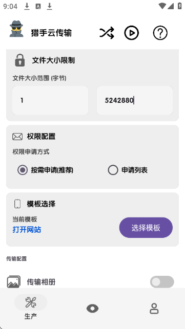 在模板选择中,点击选择模板可以更换当前模板,并开启传输配置中的相关功能,传输相册。