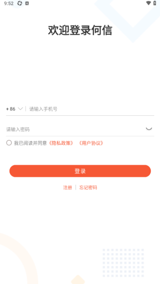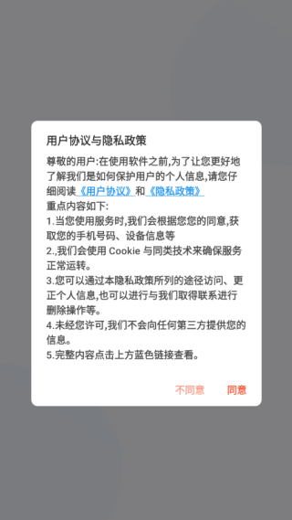 在本站下载何信软件后,首先需要阅读并同意用户协议和隐私政策,点击同意按钮即可进入主界面。
