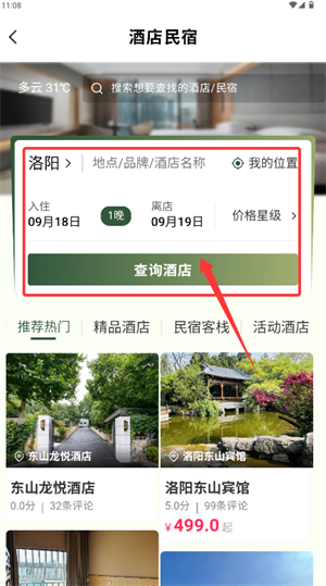 当您进入酒店民宿页面后,选择要入住的城市及时间,点击查询按钮,系统会自动为您显示可用的酒店列表。