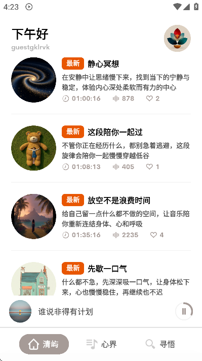 正念引导:在冥想练习中,提供正念引导音频,帮助用户更好地进入冥想状态,提升自我觉察能力。