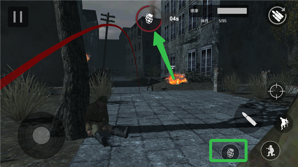 在战斗中,可以使用手榴弹,点击手榴弹图标后调整投掷位置,红圈结束后手榴弹会自动投掷,利用好这一武器可以有效清除敌人。
