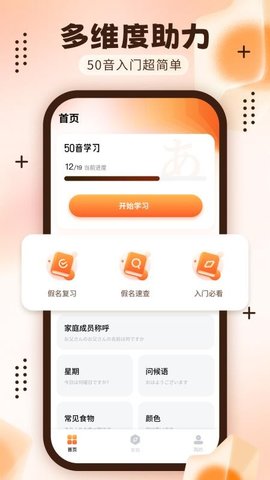 五十音学习模块: 内置完整的五十音图模块,逐个学习假名的读音、写法和用法,轻松入门日语。