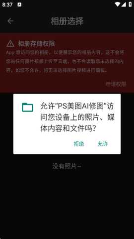 APP会请求访问设备上的照片、媒体内容和文件,点击“允许”以获取相册权限,进而选择要编辑的图片。
