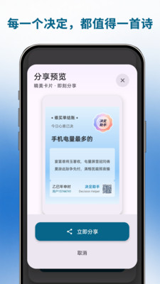 社交分享功能:决策卡的制作功能使得轻松地将自己的决策结果分享至社交平台,邀请朋友们共同参与决策,增加互动性。