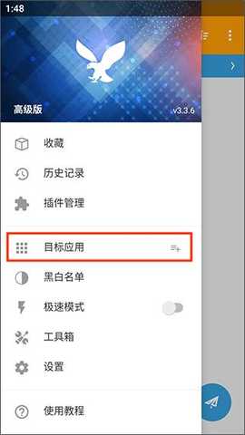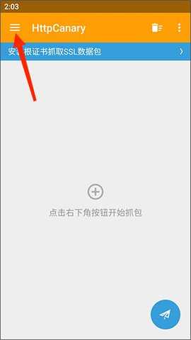 在本站下载并安装小黄鸟3.3.8抓包后,首先打开软件,点击左上角的三条横杠图标,进入主菜单。