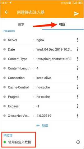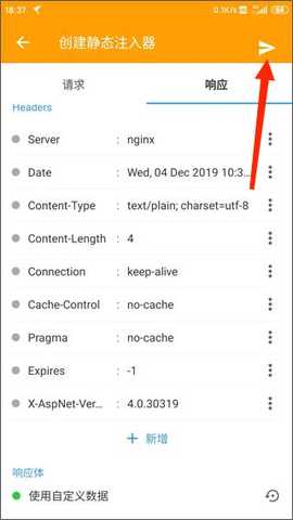 在捕获到数据后,选择静态注入,跳转到响应页面,点击编辑按钮,在body部分输入相应的32位数字,点击右上角的飞机图标进行发送。