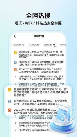 热搜资讯查看:聚合全国范围内的热搜资讯,实时更新热门信息内容,方便用户及时了解社会热点与行业动态。