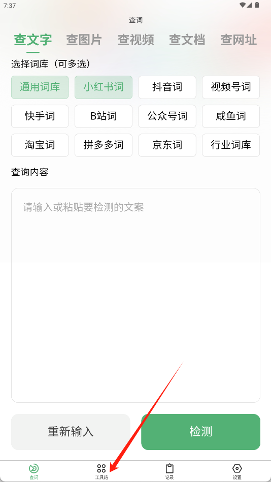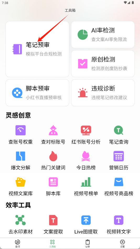 在工具箱页面,找到并点击笔记预审功能模块,进入笔记预审界面。