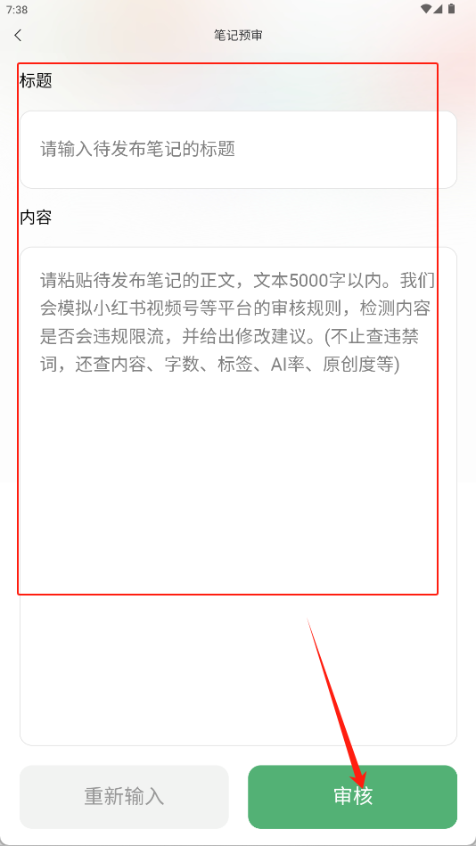 在该界面中,用户需要输入标题与正文内容,完成后点击审核按钮即可获得内容审核结果,系统会给出相应的优化建议。