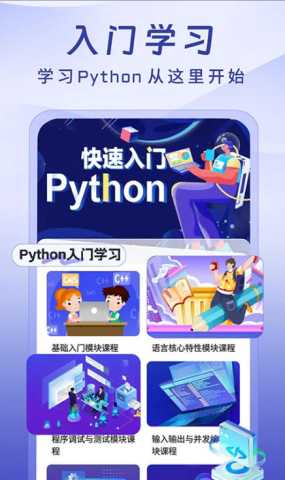 在本站下载并安装Python入门学习后,打开并同意相关政策。进入主界面后,看到丰富的课程资源,浏览不同的学习模块。