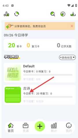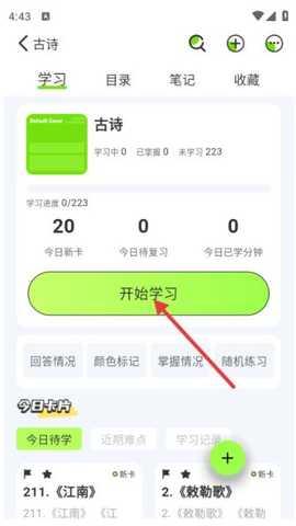 3、在古诗学习页面,点击【开始学习】按钮,进入古诗卡片学习页面。