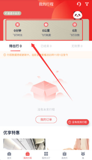3、进入“我的行程”页面,可以清晰看到累计飞行时间、总里程数以及出行次数等统计数据。