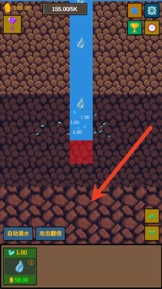 持续点击水滴或选择短暂放置,让水滴自动掉落,积累金币后,进入升级界面,使用金币提升水滴的冲击力和掉落频率。