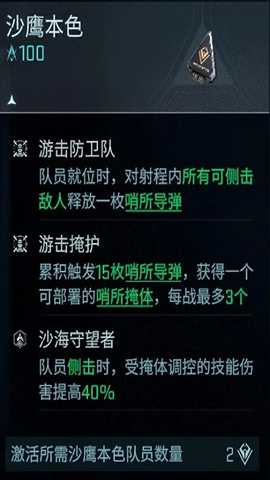 沙鹰本色是一种非常有效的战术模组,关键在于如何在队员的有效射程内进行侧击,以最大化伤害。在射程内的每个被侧击的敌人将受到导弹伤害,达成15次触发还可获得可部署的掩体。