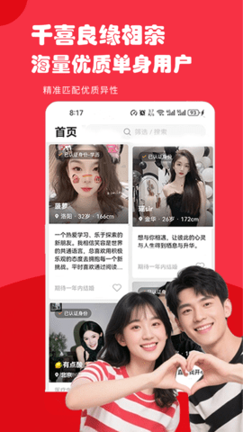 千喜良缘相亲界面简洁,操作流畅,轻松找到感兴趣的对象并进行互动。智能匹配功能有效提升了交友的精准度,增强了用户的使用体验。通过多样化的功能,能够在轻松愉快的氛围中找到志同道合的伴侣,满足了现代人对高品质交友的需求。