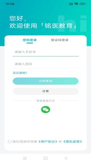 在本站下载并安装铭医医考后,打开将看到主界面,首先需要注册一个账号,填写相关信息,完成注册后即可登录。