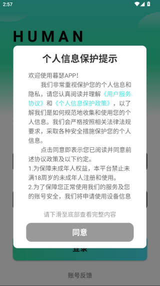 在本站下载并安装暮瑟软件后,打开并同意相关的用户服务协议和个人信息保护政策。