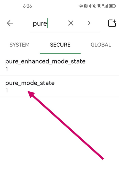 5.在“secure”里搜索“pure”,将图中位置改为“1”(默认是0),改完后就会发现纯净模式已经关闭了