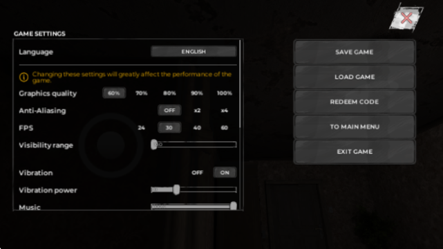 7. 在“GAME SETTINGS”界面调整游戏参数,包括语言、画面质量、抗锯齿、帧率、可视范围、振动和音乐等。右侧还提供了保存游戏、加载游戏、兑换代码、返回主菜单和退出游戏等功能选项。