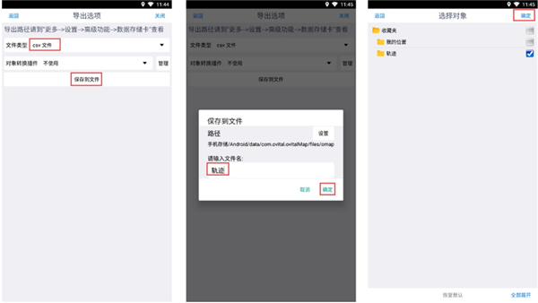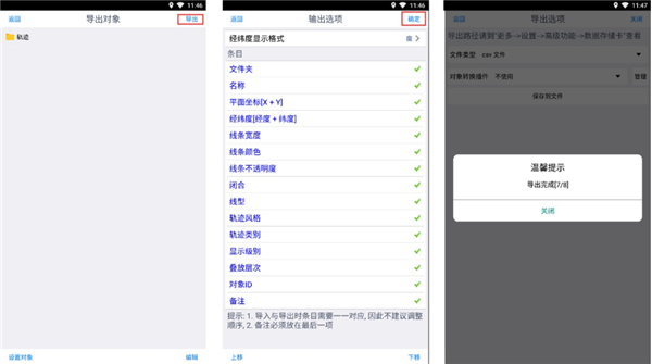 在主界面点击【收藏】→【菜单】→【导入导出】→【导出对象】。选择文件类型为CSV,设置保存路径和文件名后,勾选需要导出的轨迹对象,点击确定即可完成导出。