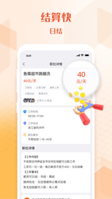 在主界面,通过搜索框输入关键词或选择分类进行岗位筛选,找到感兴趣的兼职工作。点击岗位信息后,可以查看详细的工作描述、薪资待遇及工作要求。