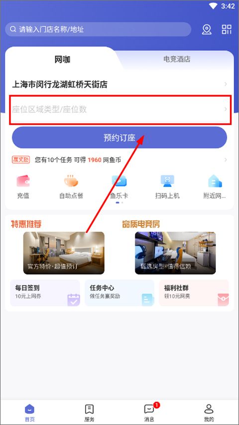 1、打开网鱼App,点击首页上方的“座位区域类型/座位数”入口;