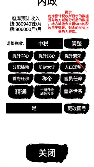 8、提升己方势力繁荣,以增加每月收入,游戏中多数行动需要资金支持。