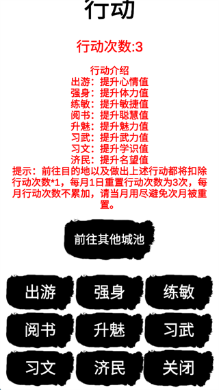 10、“行动”选项可帮助角色提升相应属性,使角色在乱世中增强自保能力。
