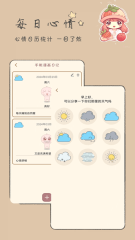 手账漫画日记是一款专为喜欢记录生活的用户设计的手机软件,通过独特的漫画风格和丰富的素材,帮助用户轻松创建个性化的手账。软件结合了多种实用功能,包括心情日记、课程表管理和记账,提供了一个温馨的空间,让用户能够随时随地记录生活的点滴。通过多样的贴纸、背景和画笔等元素,创造出独具特色的手账,充分展现个人风格,成为生活中的小助手。