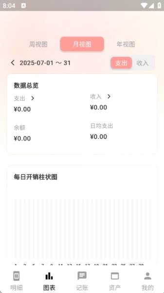 2、在“图表”页面,按周、月、年查看账单数据,更直观地了解消费情况。