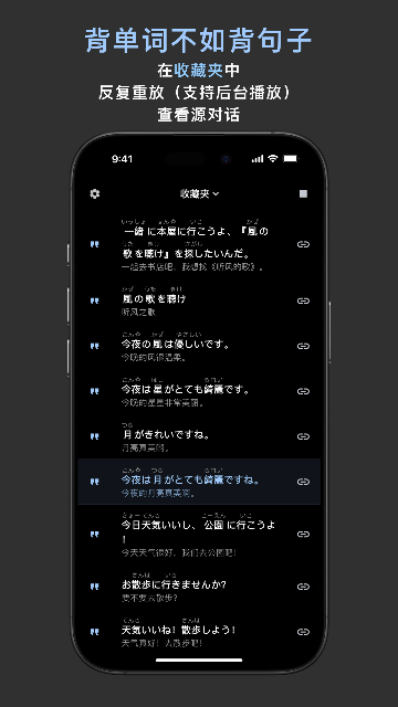 在收藏夹中,可反复重放收藏的句子,通过“背句子”的方式高效学习外语。同时,还能查看源对话,加深对句子语境的理解。