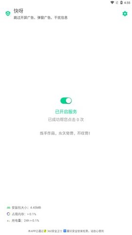 快呀跳广告app是一款专注于广告过滤的工具,浏览网页和使用社交软件时的体验。采用先进的智能识别技术,能够有效跳过各种类型的广告,包括开屏广告、弹窗广告和倒计时广告等。快呀跳广告工具操作简单,只需一键开启,便可自动运行,无需进行复杂的设置,享受一个干净而流畅的数字生活。