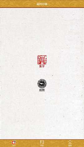 在本站下载并安装画时印章软件后,打开软件,首页会显示集字和拍照两个选项。如果手头有图片或手写的字,可以选择拍照功能,若没有则选择集字功能。
