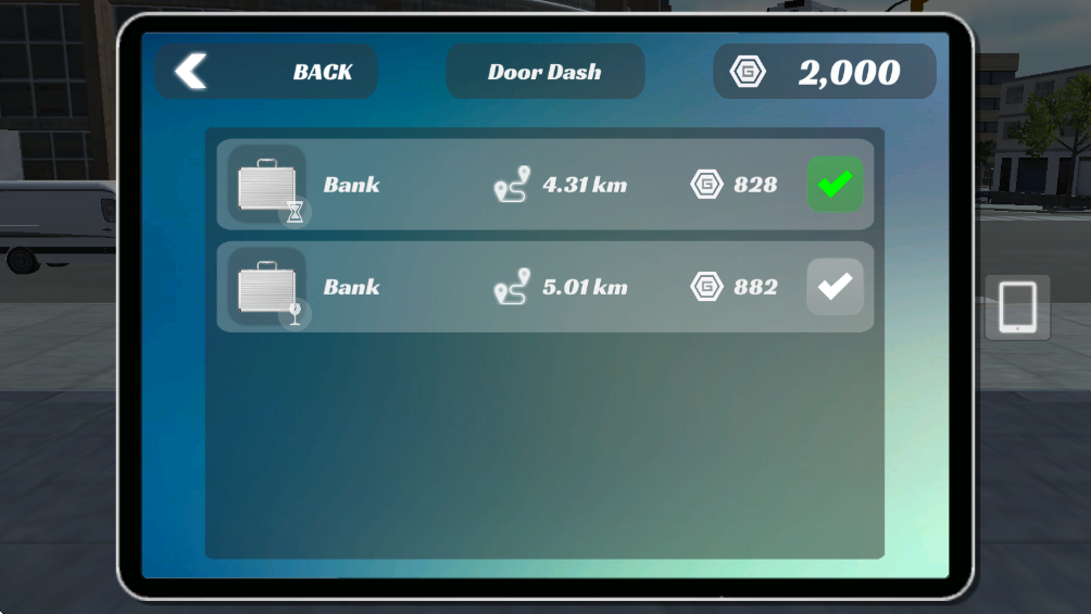 接下来点击右上角的手机图标,进入任务接取界面,选择DOOR DASH来接取配送任务。每个任务都有不同的时间限制和挑战,务必注意。