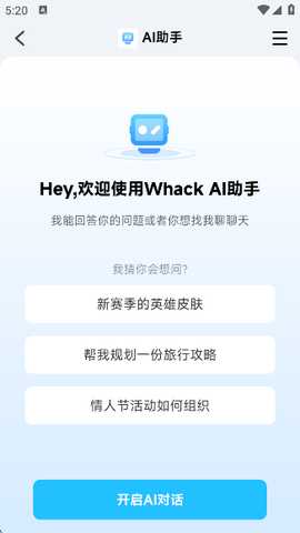 6. 进入“AI助手”界面,你可以选择预设的问题(例如新赛季的英雄皮肤、旅行攻略规划、情人节活动组织等)。