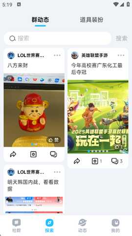4. 在“探索”界面的“群动态”板块,你可以浏览各类与游戏相关的动态(例如LOL世界赛、英雄联盟手游等),了解最新的游戏资讯和赛事信息。你还可以对这些动态进行点赞、评论和转发等操作。