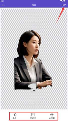 系统自动完成抠图后,可添加贴纸或更换背景,调整满意后点击保存按钮导出最终结果。