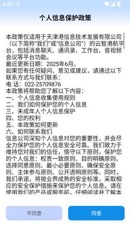 在本站下载云智港航软件后,打开APP,首先会看到一个弹框页面,点击同意后即可进入下一步。