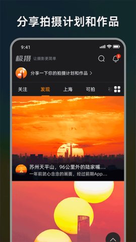 社区分享与互动:在社区内,分享自己的摄影作品、拍摄计划和机位信息,查看其他人的分享,并基于地理位置和题材偏好进行互动,增加交流的乐趣。