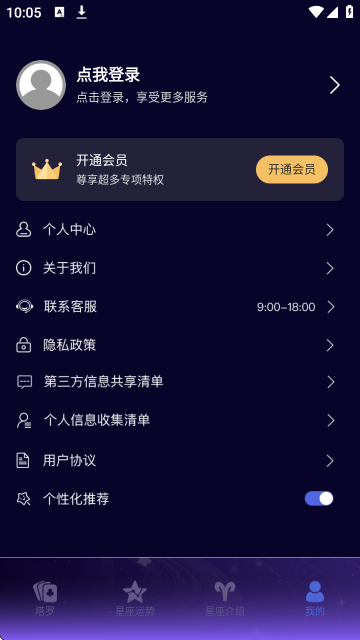 6:在“我的”板块,可进行开通会员、进入个人中心、查看关于我们、联系客服、查看隐私政策等操作,还可管理个性化推荐设置。