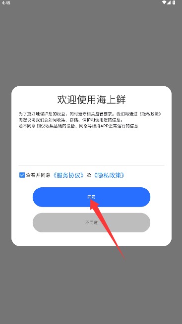 在本站下载并安装宁波海上鲜软件后,打开并仔细阅读服务协议和隐私政策,确认无误后点击同意按钮进入主界面。