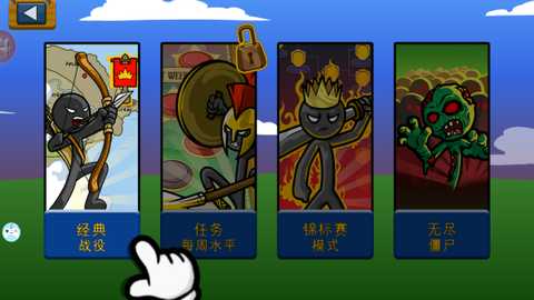 进入游戏后,将看到两个火柴人士兵,点击开始游戏即可进入战斗。可以选择经典战役、任务、锦标赛或无尽僵尸等模式,选择适合自己的挑战。