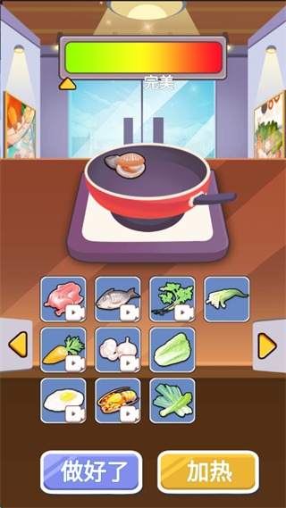 8、长按屏幕右下角的加热按钮。密切关注屏幕上方的“完美”提示,尽量让指针停留在完美区域。完成后,点击屏幕下方的“做好了”。