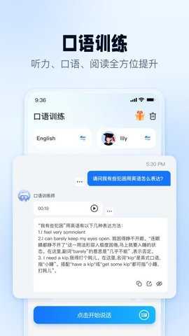 进入口语练习板块,选择对应场景,跟随示范音频进行跟读,系统会从发音和语调等多维度提供评测反馈,帮助用户不断优化口语表达。