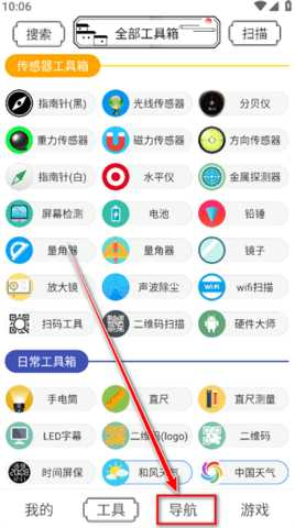 软件内设有多个大类别,如传感器工具箱、日常工具箱、图片工具箱等,根据需求选择相应的工具进行使用。