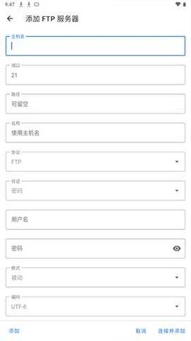 第二步,客户端配置。选择另一个空间作为客户端,在左侧菜单中点击【添加存储】,选择【FTP服务器】。设置主机名为127.0.0.1(指向服务器本机),输入刚才设定的端口和路径,填写名称以便于识别,保持协议和验证设置为默认。