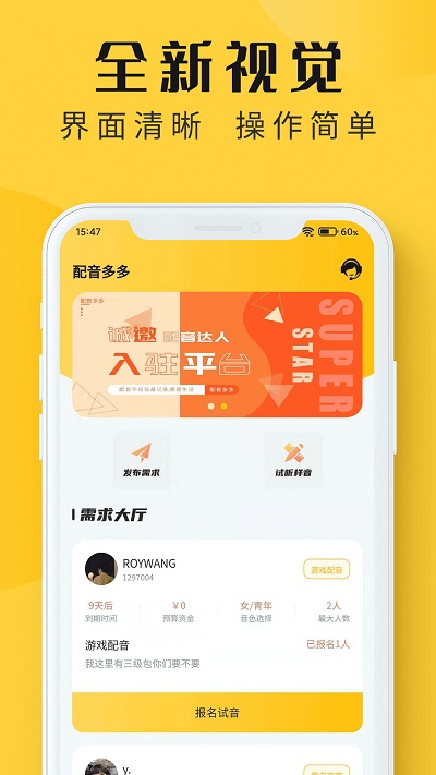 高效便捷的配音流程:只需一键发布需求,即可与配音师进行在线沟通,快速对接,节省时间。