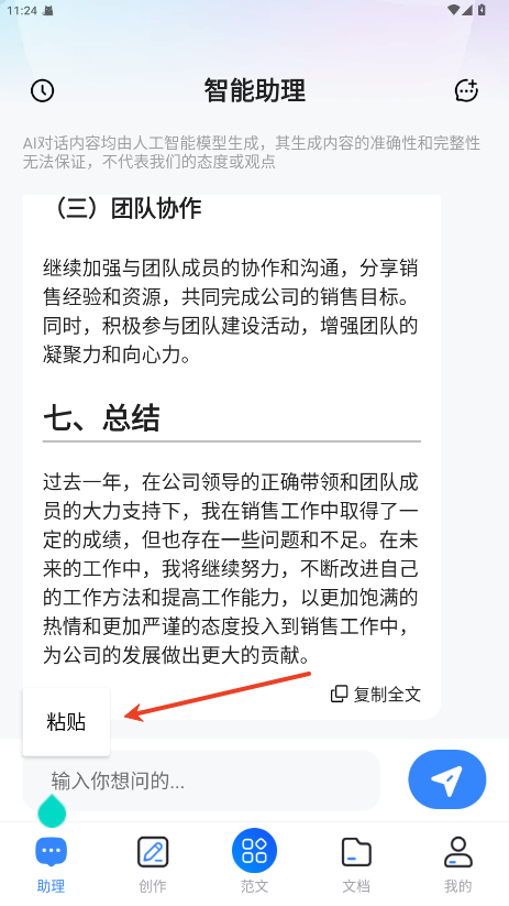登录后,在首页直接搜索所需内容,年终总结,等待智能助手生成相关回复。完成后,点击复制全文按钮即可将内容复制到剪贴板。