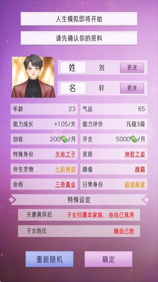 进入游戏后,首先要设置你的个人资料。这包括你的姓名、年龄、气运、以及能力成长等属性。你还可以选择特殊的身份和资质。确认所有信息后,点击【确定】正式开始游戏。你的目标是建立一个强大的家族,最终在上京称霸。