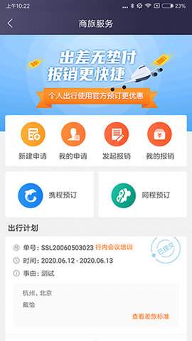 商旅管理:提供出差申请、预订、报销及统一结算的全流程管理,方便员工灵活预订机票、酒店及高铁票。
